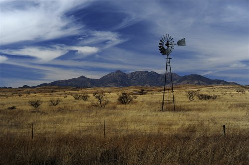 This pasture is in the foothills of the Santa Rita Mountains south of Tucson, Arizona. The windmill pumps water for the cattle.